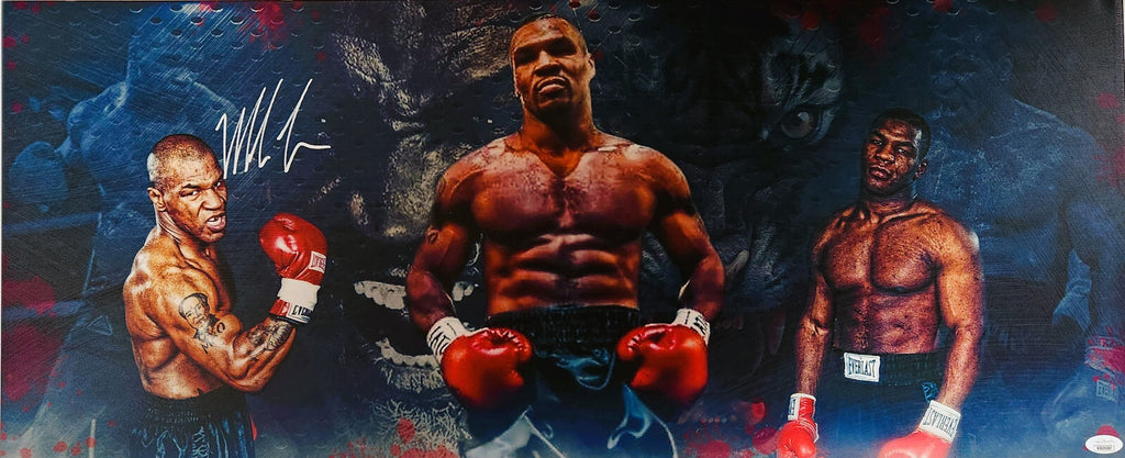 13x31 inch Stretched Canvas Collage hand signed by Boxing Legend MIKE TYSON. The signature is in White paint pen. This item was signed at a private signing with us and would make a great addition to any collection! This autograph is guaranteed to be 100% authentic and will include a COA from JSA (James Spence Authentication).