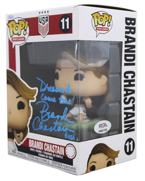 This Autographed Brandi Chastain #11 Funko Pop Vinyl Figure with the inscription of "Dreams Do Come True! 6 USA" has been Personally Signed by Brandi Chastain. This item is 100% Authentic and comes with a PSA/DNA Certification numbered Hologram. Please note that PSA/DNA no longer provides serial-numbered COA cards, and the attached PSA/DNA sticker will serve as the complete authentication for this item. The authenticity can be verified on Professional Sports Authenticators website. This item will ship in a Pop! Protector, please refer to the photos for condition of the item prior to purchase. There are some creases throughout the box of this Funko. There is a slight tear in the top of the front panel.