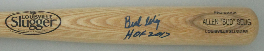 A hand signed Louisville Slugger Name Engraved bat of Milwaukee Brewers legend BUD SELIG. The signature is in Blue paint pen with the inscription "HOF 2017". This item was signed at a private signing with us. This would make a great addition to any BREWERS collection! This item is guaranteed to be 100% authentic and will include a COA from JSA authentication.
