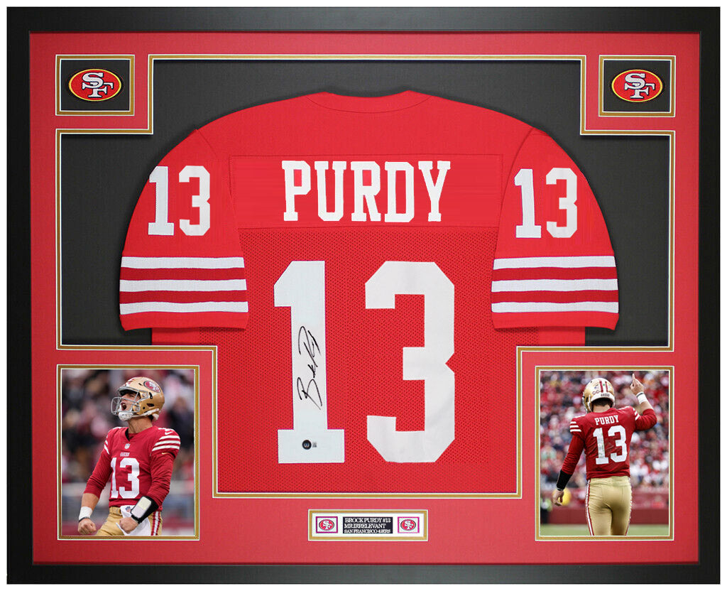 This framed jersey has been personally hand-signed by Brock Purdy. Item is accompanied by a Certificate of Authenticity issued by Beckett and a corresponding tamper-proof hologram or sticker on the jersey. To ensure authenticity, the hologram or COA can be reviewed online. This process helps to ensure that the product purchased is authentic and eliminates any possibility of duplication or fraud. It measures 35" x 43" and comes ready to hang in your home or office.