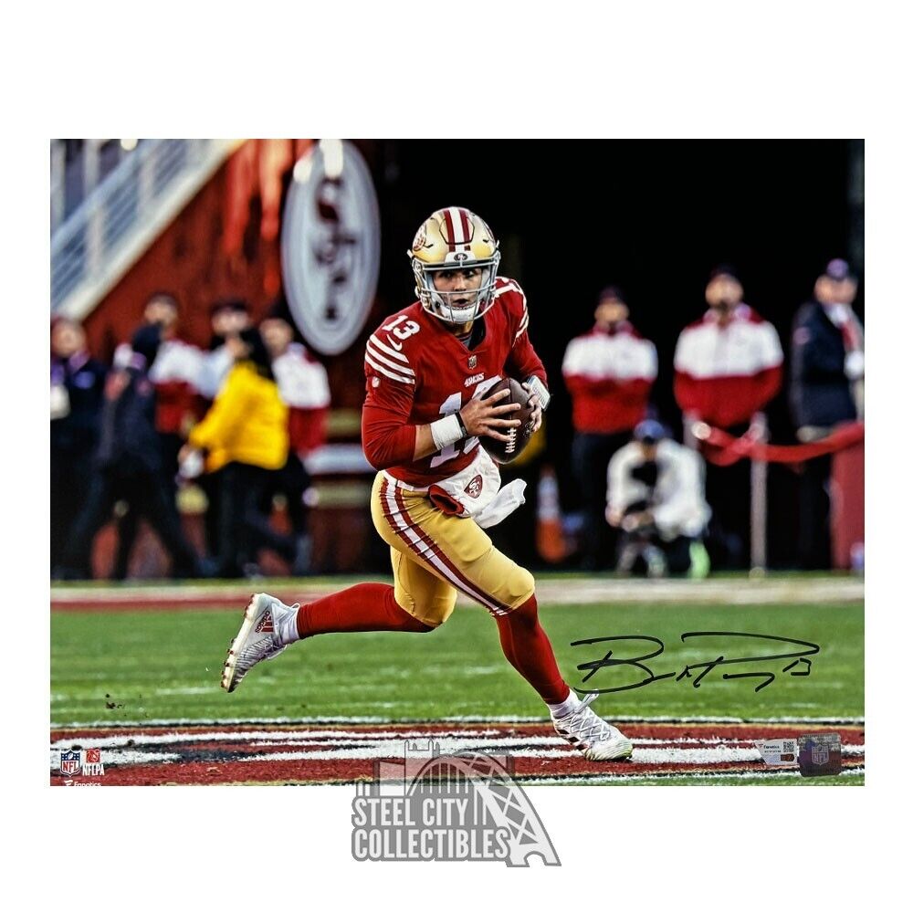 This Brock Purdy autographed 16x20 football photo comes authenticated by Fanatics.