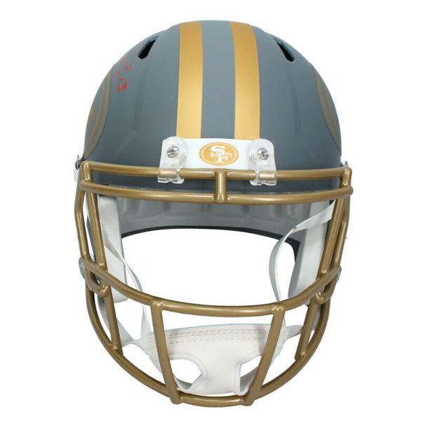 This San Francisco 49ers 'Slate' full size replica speed helmet has been personally hand-signed by Brock Purdy. It is officially licensed by the National Football League and comes with an individually numbered, tamper-evident hologram from Fanatics Authentic. To ensure authenticity, the hologram can be reviewed online. This process helps to ensure that the product purchased is authentic and eliminates any possibility of duplication or fraud.The autograph includes an official Fanatics hologram and matching COA for authenticity purposes.Comes with a tamper-evident hologram from Fanatics AuthenticatedOfficially licensed by the NFL MONEY BACK GUARANTEE! If for any reason you are not completely satisfied with the quality or authenticity of your purchase, we will gladly give you a full refund or exchange, whichever you prefer up to 30 days after purchase. Please feel free to e-mail us with any questions. GOOD LUCK BIDDING!!! Authenticator Pre-Certified Authenticator: Fanatics Authenticated History of item: Brock Purdy has signed this item in the presence of a representative from Fanatics. Describe how you came to possess this item: Super Sports Center is a fully authorized dealer for Upper Deck Authenticated as well as Mounted Memories and Steiner Sports. Other information about you and / or the item: Super Sports Center strives to deliver the most authentic in sports memorabilia from trusted companies like Mounted Memories, Steiner Sports and Upper Deck Authenticated. If it exists, we can find it for you!