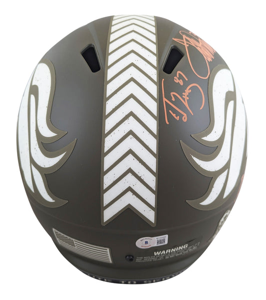 This Autographed Alternate Salute To Service Riddell Full Size Speed Rep Helmet with the inscription of "Back 2 Back Champs (Smith), Mile High Salute (McCaffrey)" has been Personally Signed by John Elway, Shannon Sharpe, Terrell Davis, Rod Smith & Ed McCaffrey of the Denver Broncos. This item is 100% Authentic to include a hologram by Beckett Authentication Services. This item will come with the new Beckett Authentication hologram that has a scannable QR code rather than the traditional COA. If you would like to have a COA, you are welcome to reach out to Beckett for a printed certification once you receive your item. This is a BAS Witnessed Protection Program item which means a Beckett Authentication Service representative was present when this item was being signed. We conducted an autograph signing with John Elway, Shannon Sharpe, Terrell Davis, Rod Smith & Ed McCaffrey where multiples of the same item were signed. While the photographs are representative of this item, the size, placement and strength of the signature may vary. Each item is hand signed, therefore, each autograph is unique. This item can be verified through BAS Witnessed.