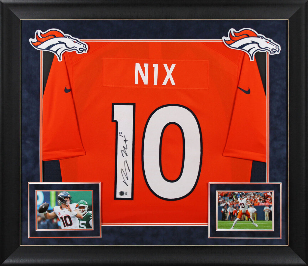 This Autographed Orange Nike Limited Framed Jersey has been Personally Signed by Bo Nix of the Denver Broncos. This item is 100% Authentic to include a hologram by Beckett Authentication Services. This item will come with an affixed Beckett Authentication Services (BAS) authentication sticker, which includes a scannable QR code to verify authenticity. Please note that Beckett no longer provides serial-numbered COA cards, and the attached BAS sticker will serve as the complete authentication for this item. This is a BAS Witnessed Protection Program item which means a Beckett Authentication Service representative was present when this item was being signed. We conducted an autograph signing with Bo Nix where multiples of the same item were signed. While the photographs are representative of this item, the size, placement and strength of the signature may vary. Each item is hand signed, therefore, each autograph is unique. This item can be verified through BAS Witnessed. This item has been professionally framed to overall dimensions of approximately 32 x 37 inches. These jerseys are framed to order, it takes approximately 3-4 business days for framing to be completed.