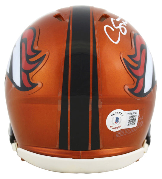 This Autographed Alternate Flash Speed Mini Helmet has been Personally Signed by Courtland Sutton of the Denver Broncos. This item is 100% Authentic to include a hologram by Beckett Authentication Services. This item will come with the new Beckett Authentication hologram that has a scannable QR code rather than the traditional COA. If you would like to have a COA, you are welcome to reach out to Beckett for a printed certification once you receive your item. This is a BAS Witnessed Protection Program item which means a Beckett Authentication Service representative was present when this item was being signed. We conducted an autograph signing with Courtland Sutton where multiples of the same item were signed. While the photographs are representative of this item, the size, placement and strength of the signature may vary. Each item is hand signed, therefore, each autograph is unique. This item can be verified through BAS Witnessed.