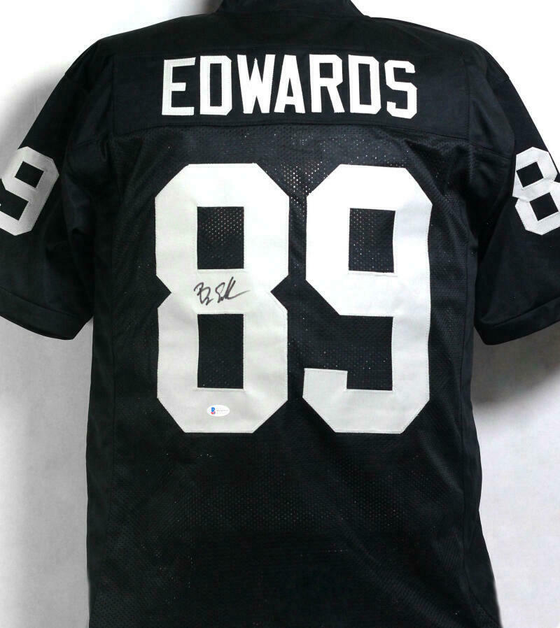 Bryan Edwards Autographed Black Pro Style Jersey - Beckett W Auth *8 THIS IS NOT AN NFL JERSEY. THIS HAS NO TAGS, NO LOGOS, NO EMBLEMS. This is a hand autographed Jersey of Bryan Edwards. This is Custom Made (non name brand) Authentic Style (stitched letters and numbers) Jersey. This item has a Beckett Witnessed Authentication, which comes with a numbered and a matching Beckett Certificate of Authenticity. You can view this item on the Beckett Authentication website. It was signed either at a public autograph appearance or a private signing. This is a stock photo of the item. Although you may not receive this exact item, the item you receive is virtually identical and brand new in great shape. Jersey size is XL.