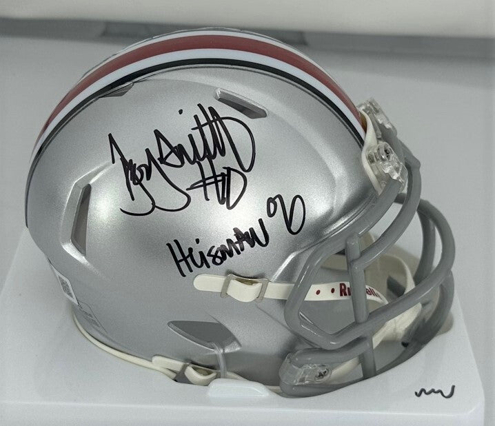Riddell Speed Mini Helmet hand signed by Ohio State Buckeyes Quarterback TROY SMITH. The signature is in Black paint pen with the inscription "Heisman '06". This item was signed at a private signing and would make a great addition to any Buckeys collection! This item is guaranteed to be 100% authentic and will include a COA hologram from Beckett Authentication.