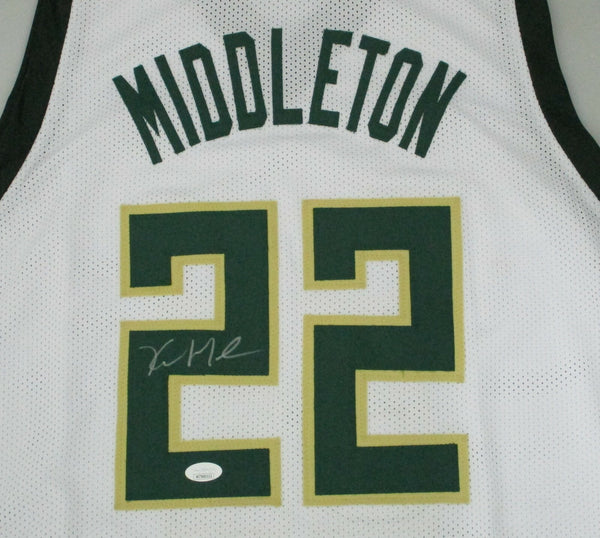 Custom Replica Milwaukee Jersey (XL) hand signed by Milwaukee Bucks All Star KHRIS MIDDLETON. The signature is in Silver paint pen. This item was signed at a public signing with us and would make a great addition to any Bucks collection! The jersey size is XL and All letters and numbers are sewn in. This autograph is guaranteed to be 100% authentic and will include a COA from JSA authentication.