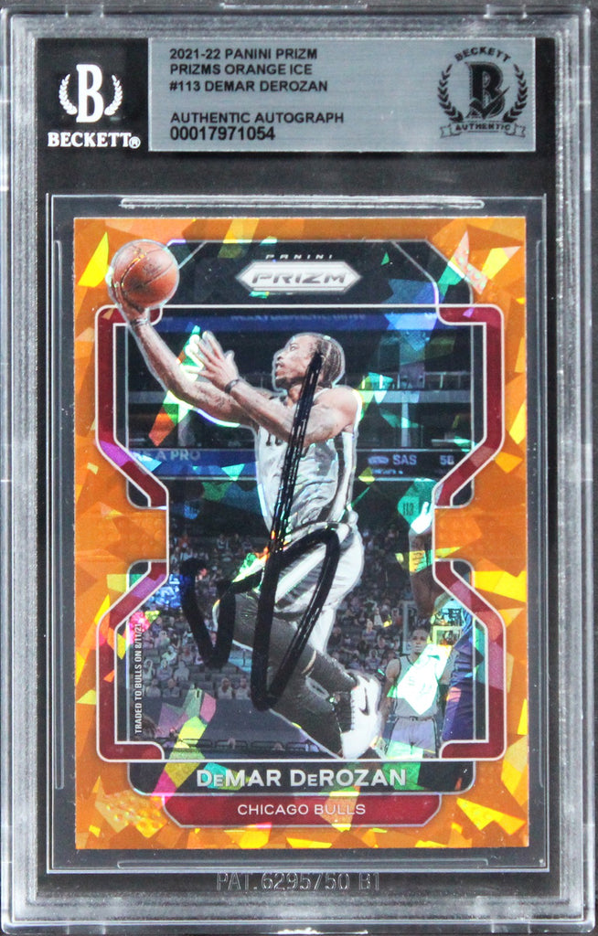 This Autographed 2021 Panini Prizm Prizms Orange Ice #113 Card has been Personally Signed by DeMar DeRozan of the Chicago Bulls. This item is 100% Authentic, it comes slabbed and authenticated by Beckett Authentication Services. The authenticity can be verified on Beckett Authentication Services website.
