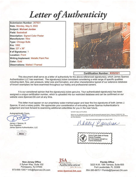 This Autographed 24x36 Framed Poster has been Personally Signed by Michael Jordan of the Chicago Bulls. This item is 100% Authentic to include a Certificate of Authenticity (COA) / hologram by JSA. The authenticity can be verified on JSA website. This item has been professionally framed to overall dimensions of approximately 33.5 x 44.5 inches.