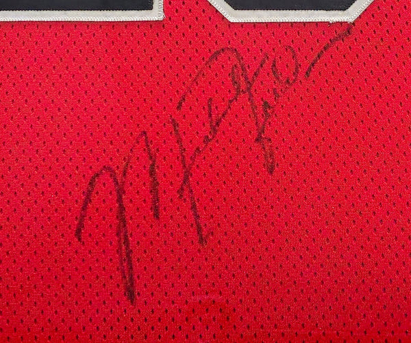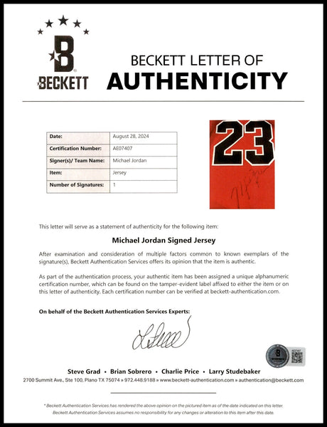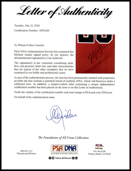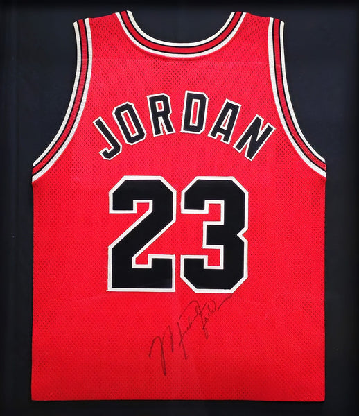 This is a framed Red Authentic Jersey, approximately 31x36 with the frame, that has been hand signed by Michael Jordan. This item has been certified authentic by PSA/DNA and comes with their tamper-proof hologram and matching full-page certificate of authenticity. This is a Vintage Signature. This item has been certified authentic by Beckett Authentication (BAS) and comes with their tamper-proof hologram and matching full-page certificate of authenticity.