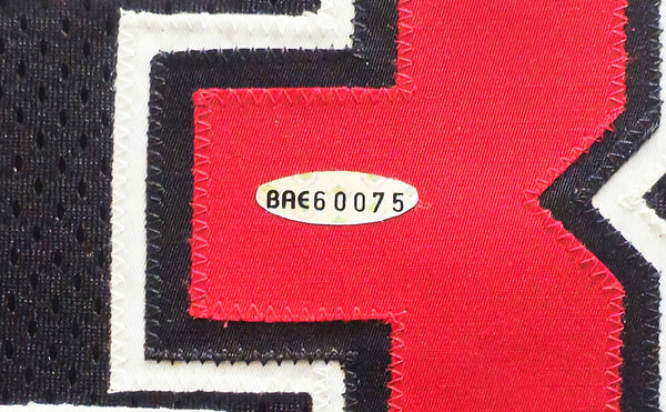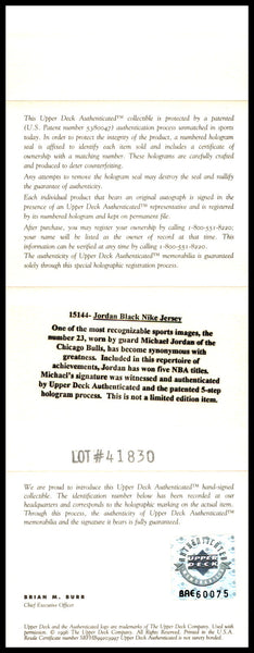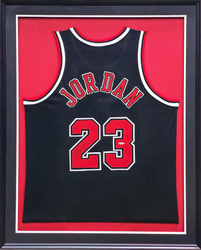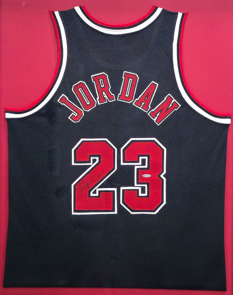 This is a framed Black Nike Chicago Bulls Jersey, approximately 33x41 with the frame, that has been hand signed by Michael Jordan. Please note, there are a few minor scuffs around the frame as shown. This item has been certified authentic by Upper Deck Authentication (UDA) and comes with their tamper-proof hologram and matching full-page certificate of authenticity.