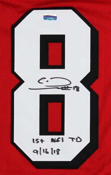 An Atlanta Custom Red Jersey, hand signed by Calvin Ridley. The item and signature are in excellent condition. In addition to signing his name, Calvin also inscribed "1st NFL TD 9/16/18" on the item. Calvin is a wide receiver for the Atlanta Falcons. He played college football at Alabama and was drafted by the Falcons in the first round of the 2018 NFL Draft. He is a First-team All-SEC (2017), Second-team All-SEC (2016), 2x CFP National Champion (2015, 2017), 2x SEC Champion (2015, 2016), and USA Today Freshman All-America (2015) - AUTHENTICATION: The item is accompanied by a Certificate of Authenticity - Serial Numbered and Databased Hologram - Picture of Calvin from the Signing -