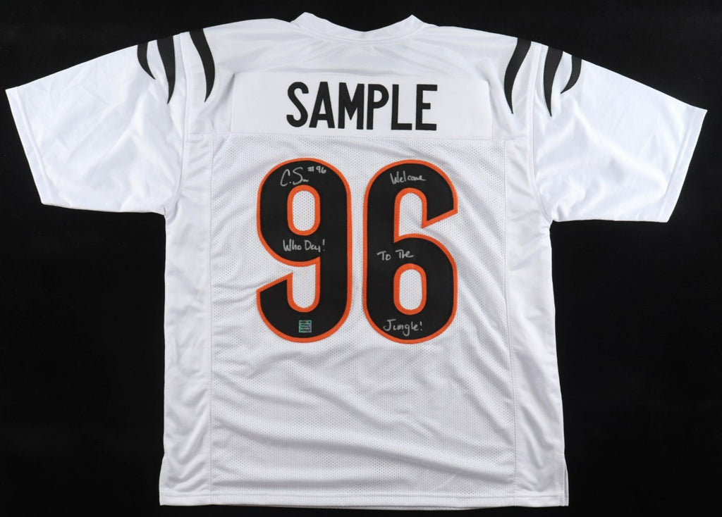 Custom on field style Jersey is size Adult XL. Everything is sewn on. Hand-signed by Cam Sample.The autograph includes an official Playball Ink Authentication Services serially numbered hologram for authenticity purposes. The signing of this item was witnessed by Playball Ink.Authentication: Playball Ink Hologram