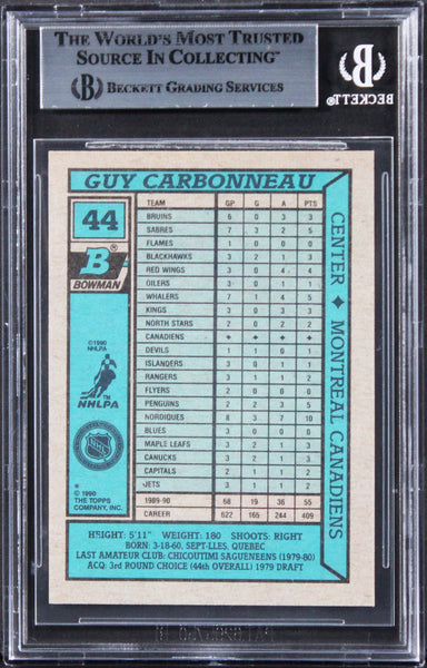 This Autographed 1990 Bowman #44 Card has been Personally Signed by Guy Carbonneau of the Montreal Canadiens. This item is 100% Authentic, it comes slabbed and authenticated by Beckett Authentication Services. The authenticity can be verified on Beckett Authentication Services website.