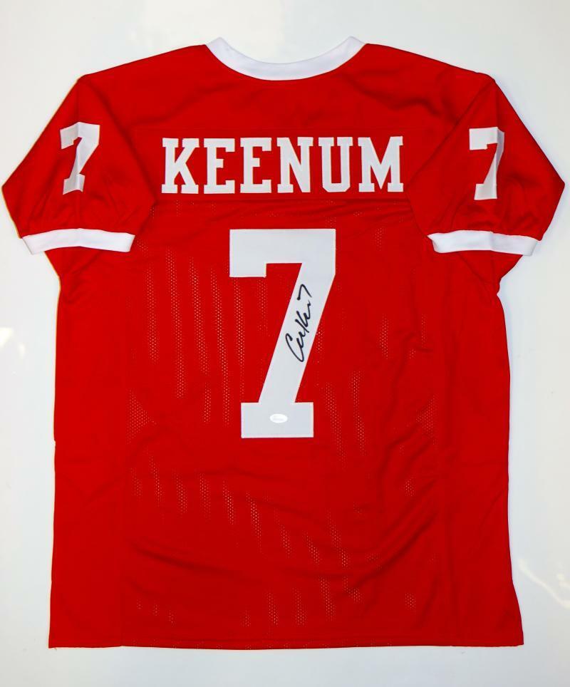 THIS IS NOT A NCAA JERSEY. This HAS NO TAGS, NO LOGOS, NO EMBLEMS. This is a hand autographed Jersey of Case Keenum. This is Custom Made (Non Name Brand) Authentic Style (Stitched Letters and Numbers). This item has a James Spence Witness Protection Authentication, which comes with a JSA numbered sticker and a matching JSA COA. You can view this item on the SpenceLOA website and it shows when and where the item was signed. It was signed either at a public autograph appearance or a Private Signing. This is a stock photo of the item. Although you may not receive this exact item, the item you receive is virtually identical and brand new in great shape. THIS IS NOT A NCAA JERSEY. This HAS NO TAGS, NO LOGOS, NO EMBLEMS. This is a hand autographed Jersey of Case Keenum. This is Custom Made (Non Name Brand) Authentic Style (Stitched Letters and Numbers). This item has a James Spence Witness Protection Authentication, which comes with a JSA numbered sticker and a matching JSA COA. You can view this item on the SpenceLOA website and it shows when and where the item was signed. It was signed either at a public autograph appearance or a Private Signing. This is a stock photo of the item. Although you may not receive this exact item, the item you receive is virtually identical and brand new in great shape.