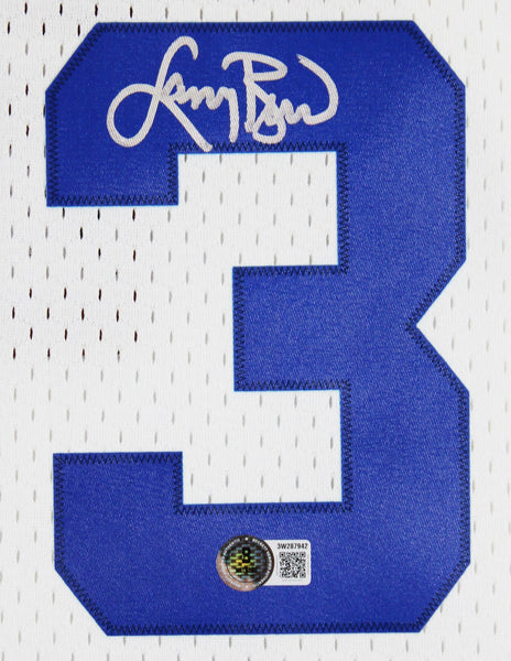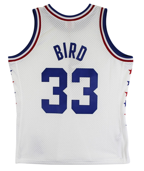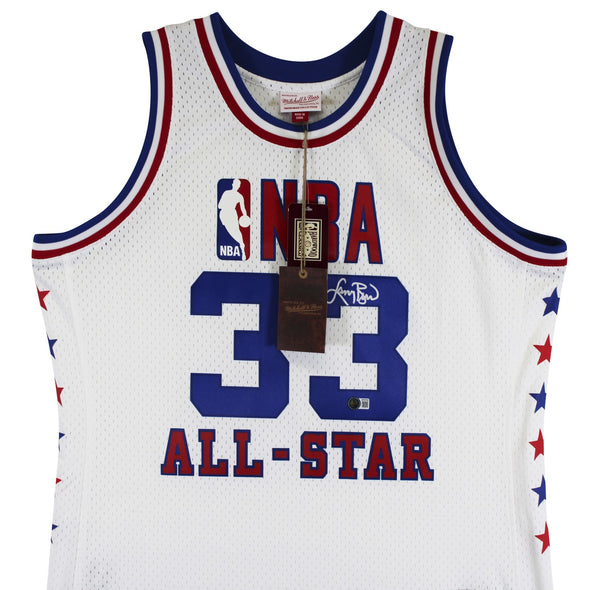 This Autographed 1986 White Mitchell & Ness All-Star Game Swingman Jersey has been Personally Signed by Larry Bird of the Boston Celtics. This item is 100% Authentic to include a hologram by Beckett Authentication Services. This item will come with an affixed Beckett Authentication Services (BAS) authentication sticker, which includes a scannable QR code to verify authenticity. Please note that Beckett no longer provides serial-numbered COA cards, and the attached BAS sticker will serve as the complete authentication for this item. This is a BAS Witnessed Protection Program item which means a Beckett Authentication Service representative was present when this item was being signed. We conducted an autograph signing with Larry Bird where multiples of the same item were signed. While the photographs are representative of this item, the size, placement and strength of the signature may vary. Each item is hand signed, therefore, each autograph is unique. This item can be verified through BAS Witnessed. This is a X-Large sized Jersey.