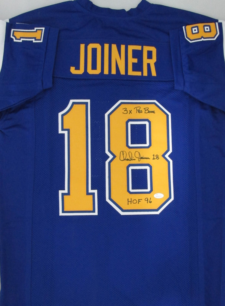 Custom Jersey hand signed by San Diego Chargers Hall of Famer CHARLIE JOINER. The signature is in Black Sharpie and includes the inscriptions "3 x Pro Bowl & HOF '96". This Item was signed at a public signing and would make a great addition to any Chargers collection! The jersey is size XL and all letters and numbers are sewn/stitched on. This item is guaranteed to be 100% authentic and will include a COA from JSA (James Spence Authentication) with matching serial numbers.