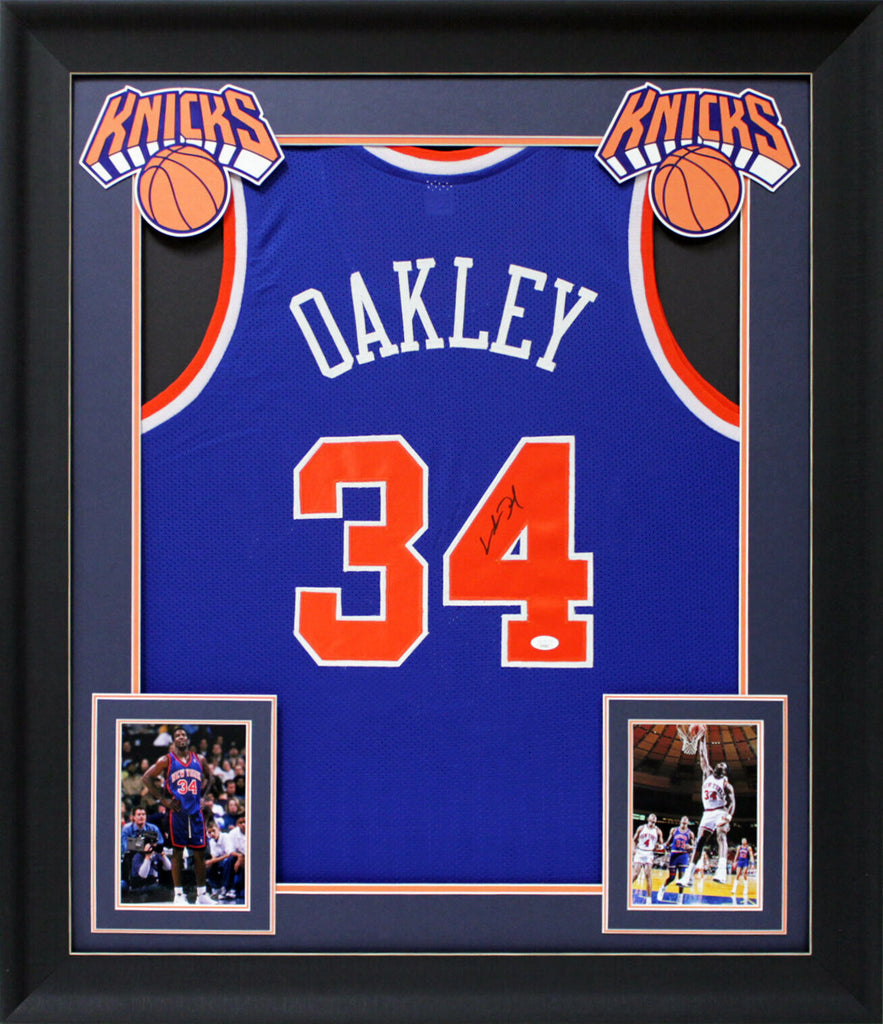 This Autographed Blue Pro Style Framed Jersey has been Personally Signed by Charles Oakley of the New York Knicks. This item is 100% Authentic to include a Certificate of Authenticity (COA) / hologram by JSA. We have multiples of this same item. While the photographs are representative of this item, the size, placement and strength of the signature may vary. Each item is hand signed, therefore, each autograph is unique. This item has been professionally framed to overall dimensions of approximately 32 x 37 inches. This is a X-Large sized, non-branded, custom-stitched Framed Jersey. This jersey will be framed to order, it will take 3-4 days from purchase date for it to ship.