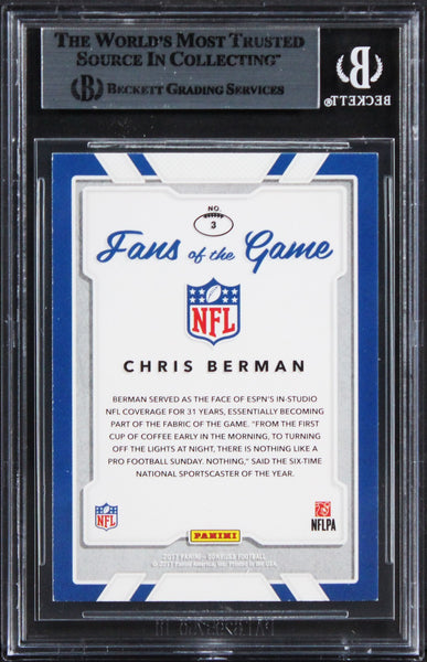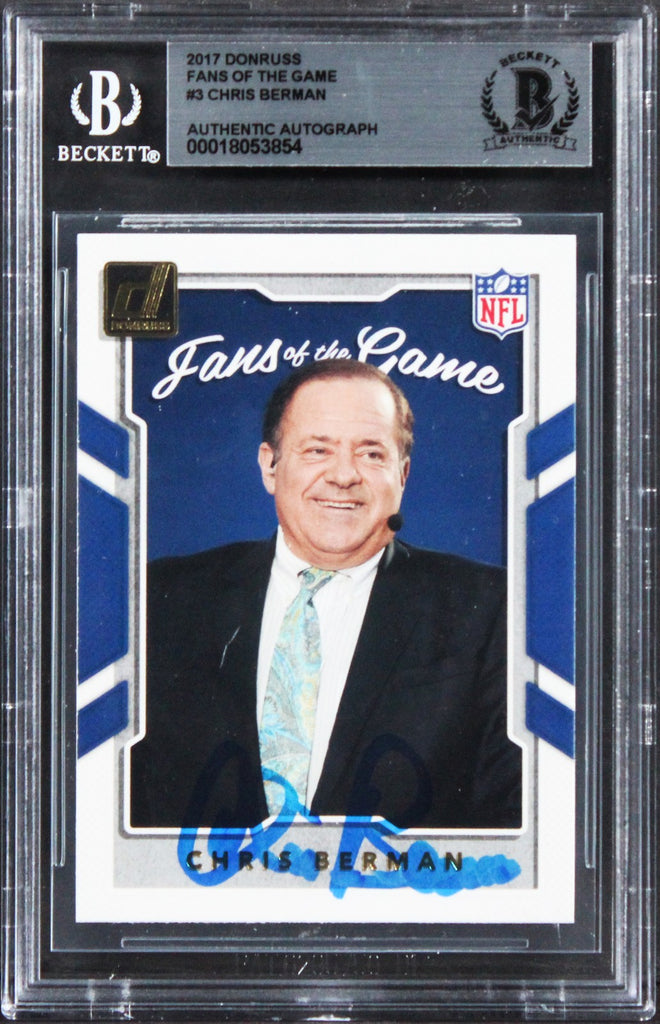 This Autographed 2017 Donruss Fans Of The Game #3 Card has been Personally Signed by Chris Berman. This item is 100% Authentic, it comes slabbed and authenticated by Beckett Authentication Services. The authenticity can be verified on Beckett Authentication Services website.