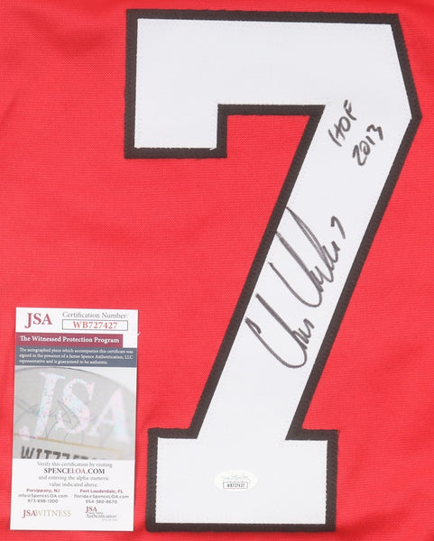 Custom on-ice style jersey. Everything sewn on, size XL. Hand-signed and inscribed by Chris Chelios (Chicago Blackhawks, Detroit Red Wings, HOF).The autograph(s) includes an official James Spence Authentication (JSA) hologram and matching COA for authenticity purposes. The signing of this item was witnessed by JSA.Authentication: JSA COA