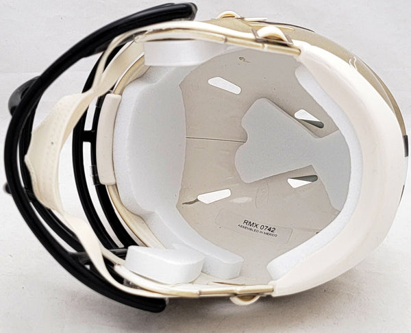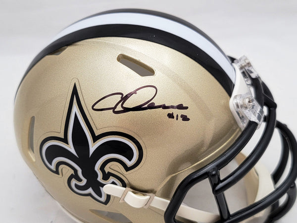 This is a New Orleans Saints Gold Speed Mini Helmet that has been hand signed by Chris Olave. This item has been certified authentic by Beckett Authentication (BAS) and comes with their tamper-proof QR Code sticker that can be verified on the Beckett-authentication.com.