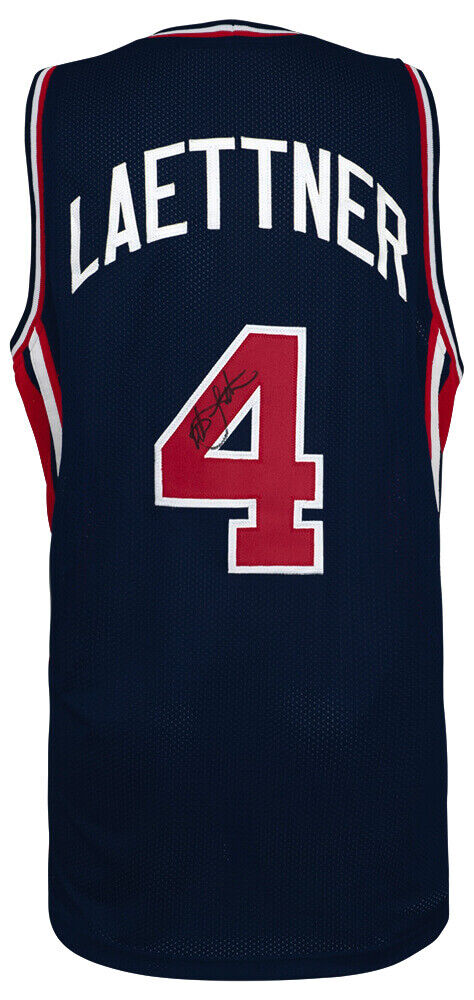 Christian Laettner signed USA navy custom basketball jersey. Item comes with a Schwartz Sports Memorabilia tamper-proof numbered hologram and Certificate of Authenticity which can be verified online. Jersey is size XL.