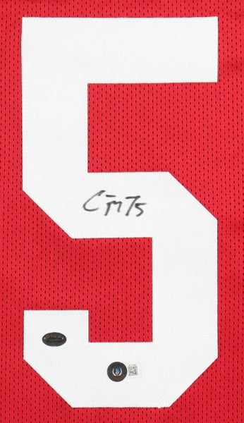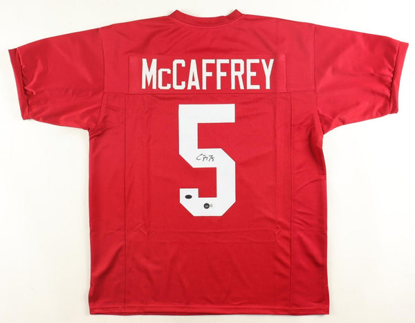 Custom on-field style jersey. Everything sewn on, size XL. Hand-signed and inscribed in black felt-tip pen by Christian McCaffrey The autograph includes an official Beckett Authentication Services serially-numbered hologram and QR Code card for authenticity purposes.Authentication: Beckett Scannable QR Code card