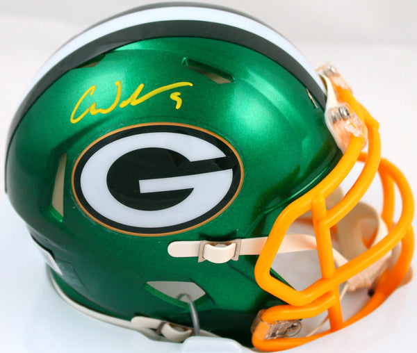 Christian Watson Autographed Green Bay Packers Flash Speed Mini Helmet-Beckett W Hologram *Yellow This is a Christian Watson of the Green Bay Packers hand autographed Riddell Football Flash Speed Mini Helmet. This item has a Beckett Witnessed Authentication, which comes with a numbered sticker hologram and a QR code for verification. You can view this item on the Beckett Authentication website, it shows when and where the item was signed. It was signed either at a public autograph appearance or a private signing. This is a stock photo of the item. Although you may not receive this exact item, the item you receive is virtually identical, brand new, and in great shape.