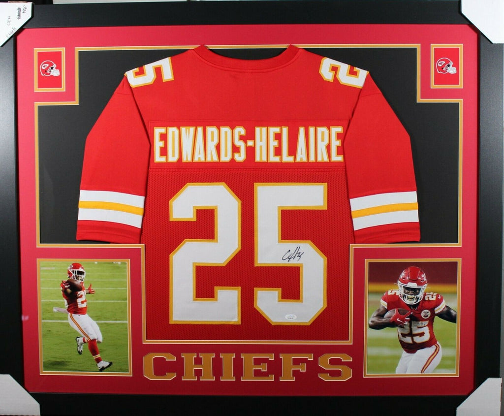 CLYDE EDWARDS-HELAIRE AUTOGRAPHED & PROFESSIONALLY FRAMED PRO-STYLE JERSEY(Occasionally our own stock pictures are used at times due to quantity of framing, all frames will look identical as the one pictured)THE FRAMED JERSEY MEASURES 35"x 44" & COMES WITH THE FOLLOWING:-UV Protected Acrylic-Triple Acid Free Team Colored Matting-2 High Quality 8"x10" Photos-Team LogoEvery framed autographed jersey is accompanied with a tamper-proof hologram on the signed part of the jersey from one of the main authenticators in the industry (JSA, Beckett, PSA, etc.) and can be verified on their corresponding websites to prove authenticity.ATTENTION:If there's any damage during shipping then please message us immediately and save the box!DO NOT OPEN A RETURN OR DISPUTE PLEASE!We will provide a return label to send the frame back so we can fix any issues right away and ship it right back to you, free of charge of course!WE DO NOT OFFER PARTIAL REFUNDS TO FIX LOCALLY AS EVERYTHING IS FRAMED/FIXED IN HOUSE- Thank you -