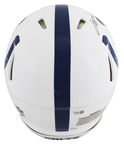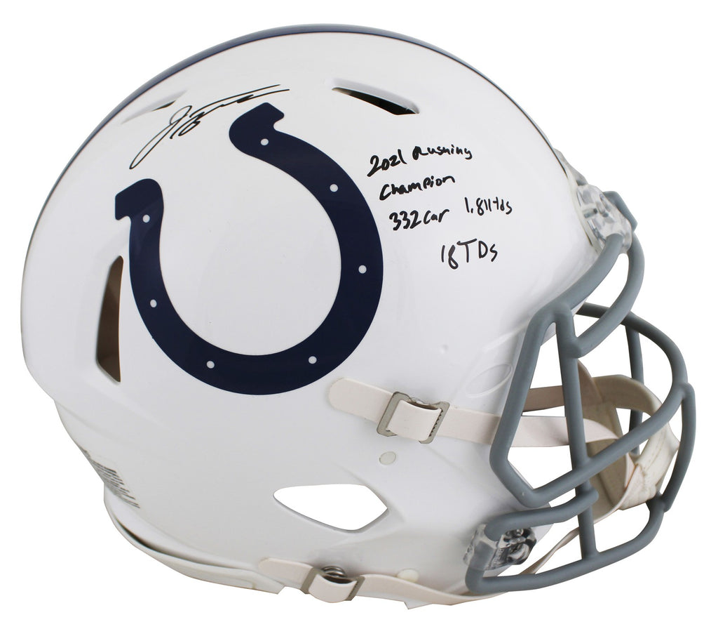 This Autographed Limited Edition #1/28 Authentic Full Size Speed Proline Helmet with the inscription of "2021 Rushing Champion, 332 Car, 181 Yds, 18 TDs" has been Personally Signed by Jonathan Taylor of the Indianapolis Colts. This item is 100% Authentic to includes a numbered hologram by Fanatics. The authenticity can be verified on Fanatics website.