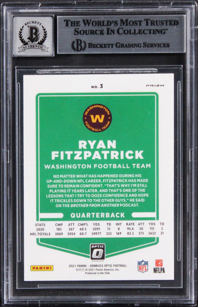 Commanders Ryan Fitzpatrick Signed 2021 Donruss Optic #3 Card Auto 10! BAS Slab