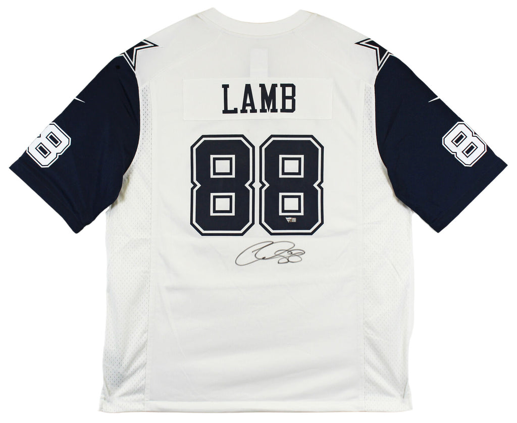 This Autographed White Color Rush Nike Game Jersey has been Personally Signed by CeeDee Lamb of the Dallas Cowboys. This item is 100% Authentic to includes a numbered hologram by Fanatics. We conducted an autograph signing with CeeDee Lamb where multiples of the same item were signed. While the photographs are representative of this item, the size, placement and strength of the signature may vary. Each item is hand signed, therefore, each autograph is unique. This item can be verified through Fanatics. Multiple sizes available. Reach out for availability.