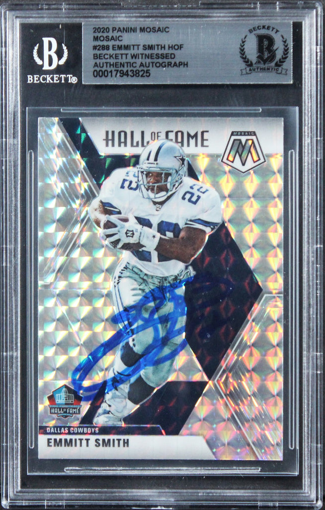 This Autographed 2020 Panini Mosaic Mosaic #288 Card has been Personally Signed by Emmit Smith of the Dallas Cowboys. This item is 100% Authentic, it comes slabbed and authenticated by Beckett Authentication Services. The authenticity can be verified on Beckett Authentication Services website.
