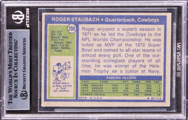 This Autographed 1972 Topps #200 Card with the inscription of "HOF 85" has been Personally Signed by Roger Staubach of the Dallas Cowboys. This item is 100% Authentic, it comes slabbed and authenticated by Beckett Authentication Services. The authenticity can be verified on Beckett Authentication Services website.
