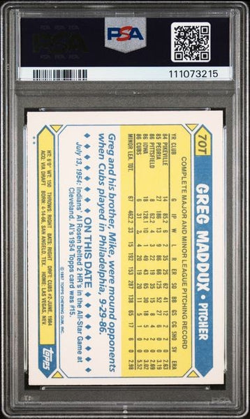 This Autographed 1987 Topps Traded #70T Rookie Card has been Personally Signed by Greg Maddux of the Chicago Cubs. This item is 100% Authentic, it comes slabbed and authenticated by PSA. This item is not autographed. The authenticity can be verified on Professional Sports Authenticator website.