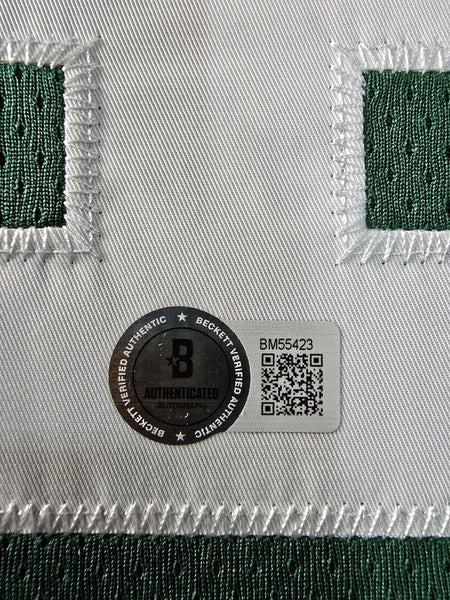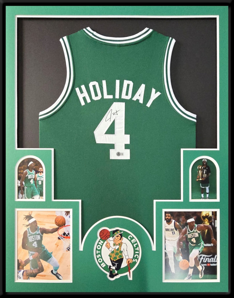 Custom Framed Jrue Holiday hand signed Boston Celtics style custom jersey Beckett Hologram The authentication is from Beckett. This signature is authenticated by a representative of Beckett! 100% AUTHENTIC!!! The jersey has fully stitched numbers on the front and back. It is a great item and a must for all great sports fans! This item is professionally framed, it measures 32"x40" inside , 42"x34" outside , using UV protective Acrylic glass for safe keeping and safe transport, team color matting, black moulding and hanging hooks on the back. All additional items in frame seen in pictures included. 100% ready to hang in your fan cave.