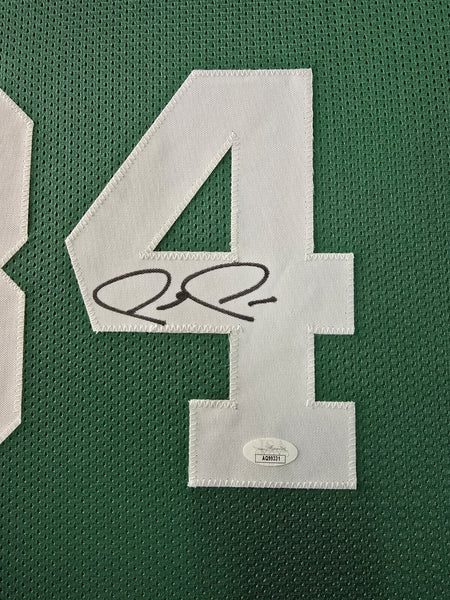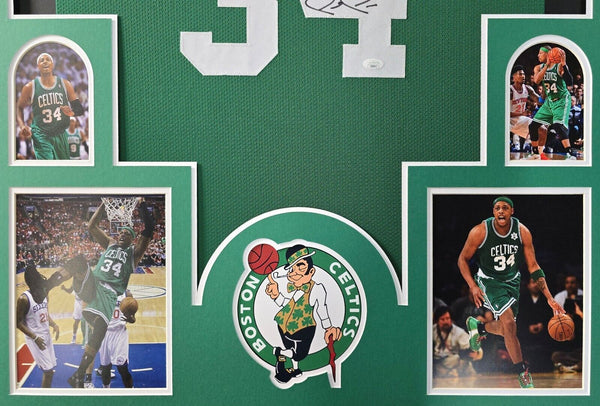 Custom Framed Paul Pierce hand signed Boston Celtics jersey JSA COA The authentication is from JSA. This signature is authenticated by a representative of JSA! 100% AUTHENTIC!!! The jersey has fully stitched numbers on the front and back. It is a great item and a must for all great sports fans! This item is professionally framed, it measures 32"x40" inside , 42"x34" outside , using UV protective Acrylic glass for safe keeping and safe transport, team color matting, black moulding and hanging hooks on the back. All additional items in frame seen in pictures included. 100% ready to hang in your fan cave.