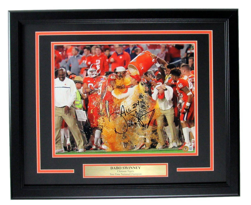 Dabo Swinney Autographed/Inscribed 11x14 Photo Clemson Tigers Framed. The outer frame size is 22 inches x 18 inches. This photo is authenticated by BAS/Beckett and includes their Tamper-proof Hologram Sticker.