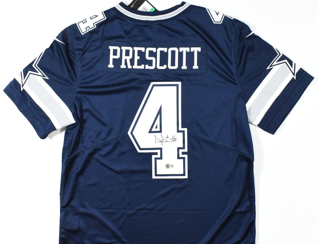 This is a hand autograph of Dak Prescott of the Dallas Cowboys on a Nike Vapor Limited Jersey. This item has a Beckett Witnessed Authentication, which comes with a Beckett numbered hologram and a QR Code for verification. You can view this item on the Beckett Authentication website. It was signed either at a public autograph appearance or a private signing. This is a stock photo of the item. Although you may not receive this exact item, the item you receive is virtually identical and brand new in great shape. Jersey size is XL. This is a hand autograph of Dak Prescott of the Dallas Cowboys on a Nike Vapor Limited Jersey. This item has a Beckett Witnessed Authentication, which comes with a Beckett numbered hologram and a QR Code for verification. You can view this item on the Beckett Authentication website. It was signed either at a public autograph appearance or a private signing. This is a stock photo of the item. Although you may not receive this exact item, the item you receive is virtually identical and brand new in great shape. Jersey size is XL.