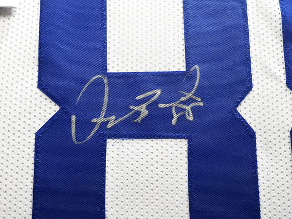 This is a framed White Jersey, approximately 31x36 with the frame, that has been hand signed by Dez Bryant. This is a custom jersey with no name brand. The approximate size is XL. It has nice sewn in name and numbers. This item has been witnessed and certified authentic by Beckett Authentication (BAS) and comes with their tamper-proof witness hologram.