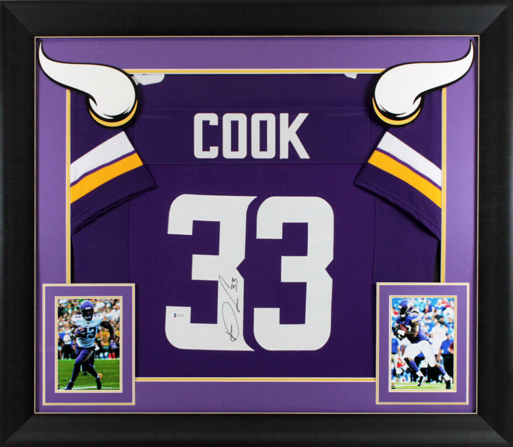 This Autographed Purple Pro Style Framed Jersey has been Personally Signed by Dalvin Cook of the Minnesota Vikings. This item is 100% Authentic to include a hologram by Beckett Authentication Services. This item will come with the new Beckett Authentication hologram that has a scannable QR code rather than the traditional COA. If you would like to have a COA, you are welcome to reach out to Beckett for a printed certification once you receive your item. This is a BAS Witnessed Protection Program item which means a Beckett Authentication Service representative was present when this item was being signed. We conducted an autograph signing with Dalvin Cook where multiples of the same item were signed. While the photographs are representative of this item, the size, placement and strength of the signature may vary. Each item is hand signed, therefore, each autograph is unique. This item can be verified through BAS Witnessed. This item has been professionally framed to overall dimensions of approximately 32 x 37 inches. This is a X-Large sized, non-branded, custom-stitched Framed Jersey. This jersey will be framed to order, it will take 3-4 days from purchase date for it to ship.