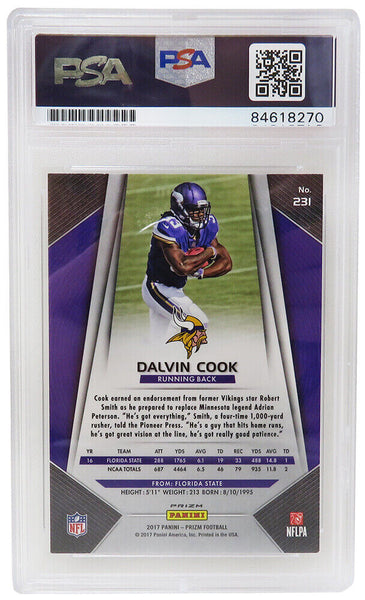 Dalvin Cook signed Minnesota Vikings 2017 Panini Prizm Silver football rookie card #231. The card has been authenticated and encapsulated by PSA and the authentication number can be verified online. The image of the item is a stock photo, as we may have multiples of the item in stock. The Slabbed Card you will receive will be of the card described. (Same grade, Same authentication) You may or may not receive the exact PSA serial number on the slab label shown in image.