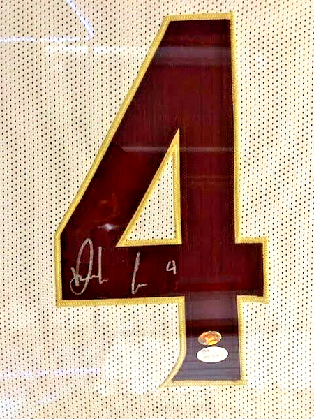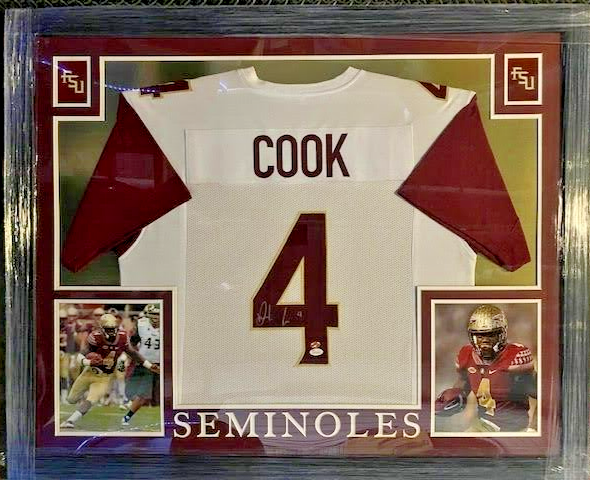 Custom frame measures approximately 35" x 43" in size and features a jersey which has been hand-signed in black felt-tip pen by Dalvin Cook. The autograph includes an official James Spence Authentication (JSA) hologram for authenticity purposes. The signing of this item was witnessed by JSA.Authentication: JSA Hologram