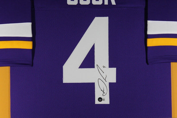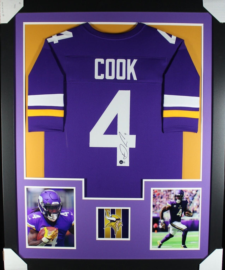 DALVIN COOK AUTOGRAPHED & PROFESSIONALLY FRAMED PRO-STYLE JERSEY(Occasionally our own stock pictures are used at times due to quantity of framing, all frames will look identical as the one pictured)THE FRAMED JERSEY MEASURES 35"x 44" & COMES WITH THE FOLLOWING:-UV Protected Acrylic-Triple Acid Free Team Colored Matting-2 High Quality 8"x10" Photos-Team LogoEvery framed autographed jersey is accompanied with a tamper-proof hologram on the signed part of the jersey from one of the main authenticators in the industry (JSA, Beckett, PSA, etc.) and can be verified on their corresponding websites to prove authenticity.