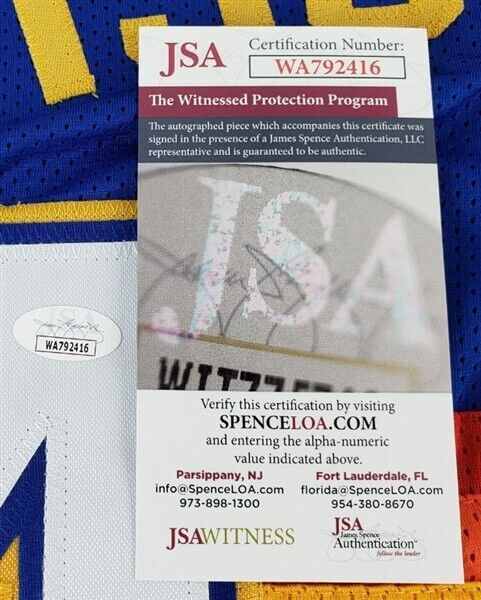 This autographed jersey has been personally hand-signed by Dan Issel of the Denver Nuggets. Issel added the inscription "HOF 93" along with his signature. This autograph is certified by James Spence Authentication's (JSA) Witnessed Protection Program. That means that a JSA representative was present when this item was signed. It comes with the numbered hologram and matching Certificate of Authenticity.Custom on-field style jerseys are a more affordable option for autograph seekers. These jerseys do not have any brand name or tags and are made in the Philippines. They feature stitched on names and numbers and are made to look very similar to the on-field jerseys that the players wear. These custom jerseys are very commonly used in the memorabilia industry.