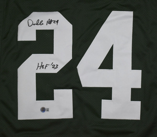 THIS IS NOT AN NFL JERSEY. THIS HAS NO TAGS, NO LOGOS, NO EMBLEMS. This is a Hand Autographed Jersey of Darrelle Revis on a custom made (Non Name Brand) authentic style (Stitched Letters and Numbers) jersey. Inscribed HOF. This item has a Beckett Witnessed Authentication, which comes with a Beckett numbered hologram and a QR code for verification. You can view this item on the Beckett website and it shows when and where the item was signed. It was signed either at a public autograph appearance or a private signing. This is a stock photo of the item. Although you may not receive this exact item, the item you receive is virtually identical and brand new in great shape. Jersey THIS IS NOT AN NFL JERSEY. THIS HAS NO TAGS, NO LOGOS, NO EMBLEMS. This is a Hand Autographed Jersey of Darrelle Revis on a custom made (Non Name Brand) authentic style (Stitched Letters and Numbers) jersey. Inscribed HOF. This item has a Beckett Witnessed Authentication, which comes with a Beckett numbered hologram and a QR code for verification. You can view this item on the Beckett website and it shows when and where the item was signed. It was signed either at a public autograph appearance or a private signing. This is a stock photo of the item. Although you may not receive this exact item, the item you receive is virtually identical and brand new in great shape. Jersey size is XL.