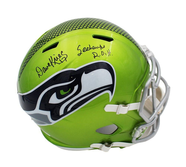 A Seattle Seahawks Speed Replica Flash NFL Helmet hand signed by Dave Krieg. The item and signature are in excellent condition. In addition to signing his name, Dave also inscribed "Seahawks R.O.H" on the item. Dave is a former NFL quarterback football player who spent the majority of his career with the Seattle Seahawks. AUTHENTICATION: The item is accompanied by a JSA Certificate of Authenticity - JSA Serial Numbered and Databased Hologram