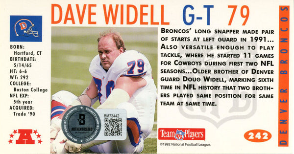 The number in the listing title is just an inventory sku for our records and is not the authentication number. This is the exact item that you will receive so please see pictures for condition. This is a trading card that was personally autographed by Dave Widell. Includes a certificate of authenticity from Beckett Authentication Services (BAS) and Denver Autographs.