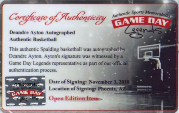 This basketball was autographed by Deandre Ayton. It is officially licensed by the National Basketball Association and comes with an individually numbered, tamper-evident hologram from Super Sports Center Authenticated as well as Steiner Sports Authentic. Your signed item can be identified and verified for authenticity by entering the serial number from your hologram into our online database. This process confirms and guarantees that your collectible is authentic and eliminates all possibility of duplication and fraud.This product is guaranteed authentic and includes a Super Sports Center Certificate of Authenticity and an accompanying tamper-evident hologram.